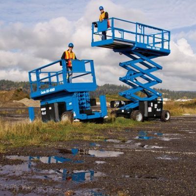 The Genie GS-3369 RT rough terrain scissor lift is built for rugged performance and is able to travel through uneven and rough ground. It is an ideal machine for demanding outdoor worksites. With a maximum full-height drive of up to 11.96m, this scissor can get your construction team up into the highest and most out-of-reach places. Discover this machine's true versatility when you hire with Tiger Plant.